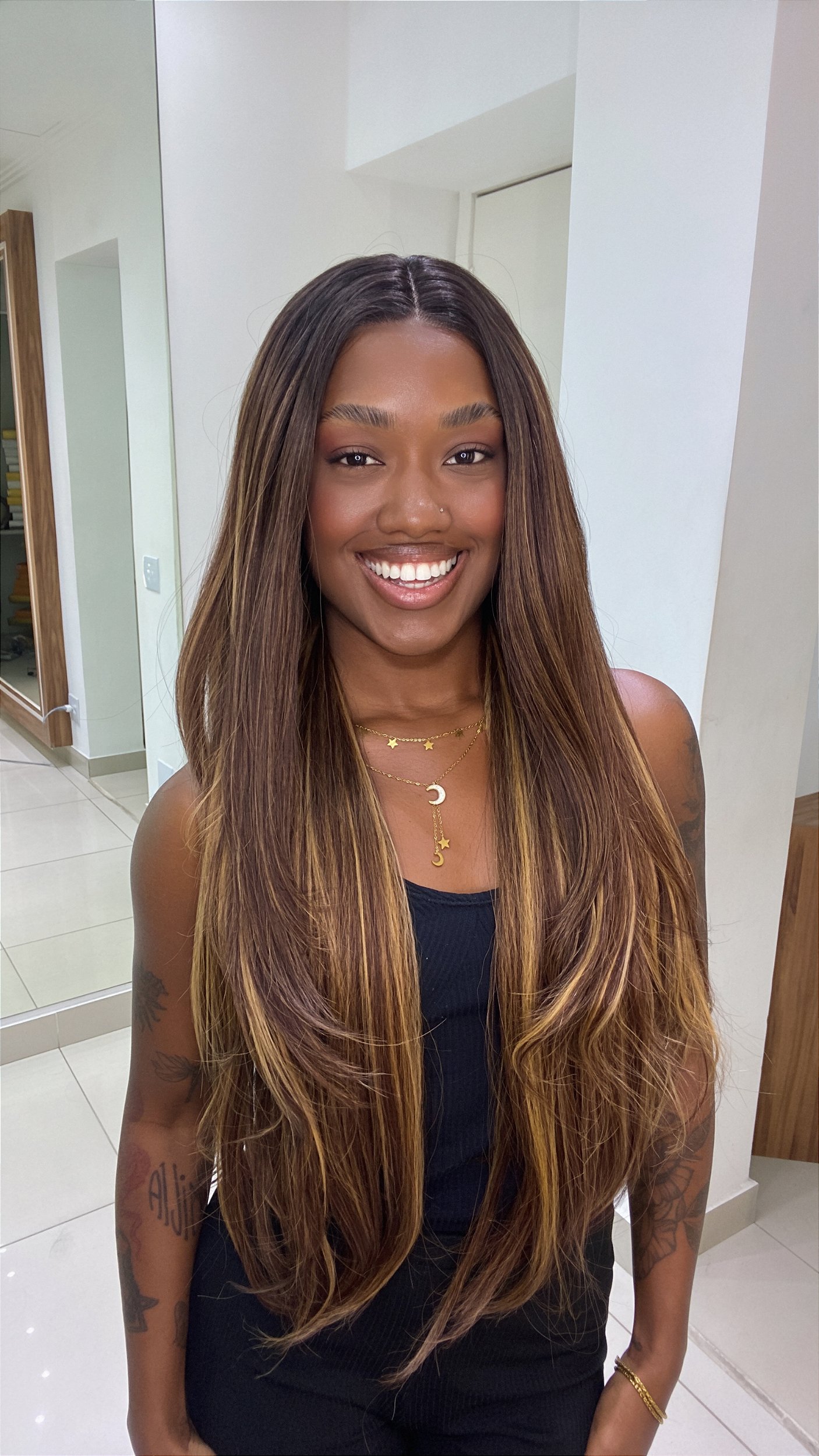 A lace frontal transparente cria um efeito realista na raiz, enquanto os fios mantêm brilho suave e movimento leve.