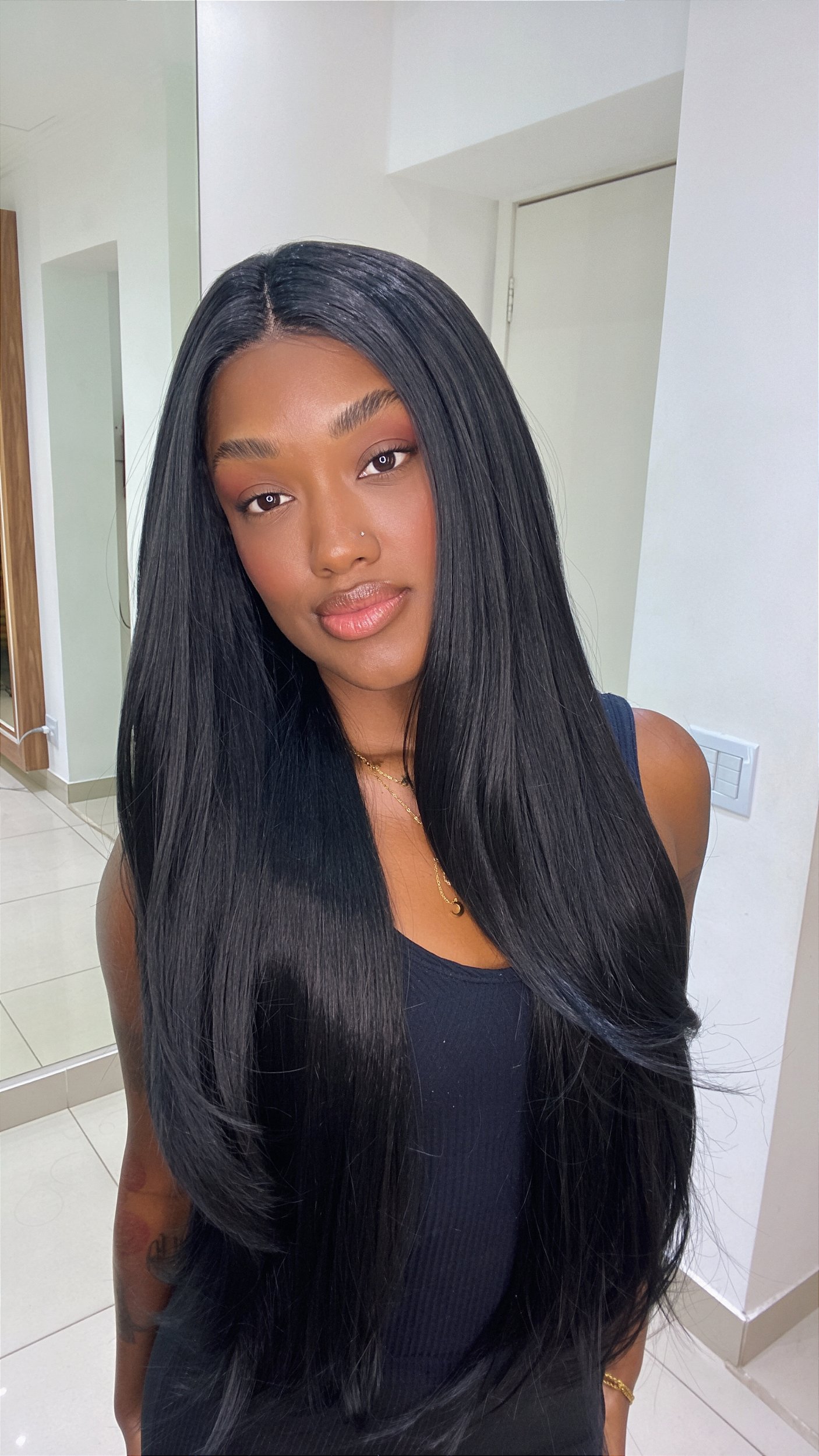 A lace frontal transparente cria um efeito realista na raiz, enquanto os fios mantêm brilho suave e movimento leve.