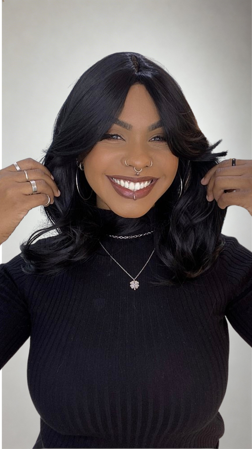 Clique em Comprar Agora e leve sua Peruca Fibra Futura Ondulado Franja Niara Preta com frete rápido e suporte personalizado.