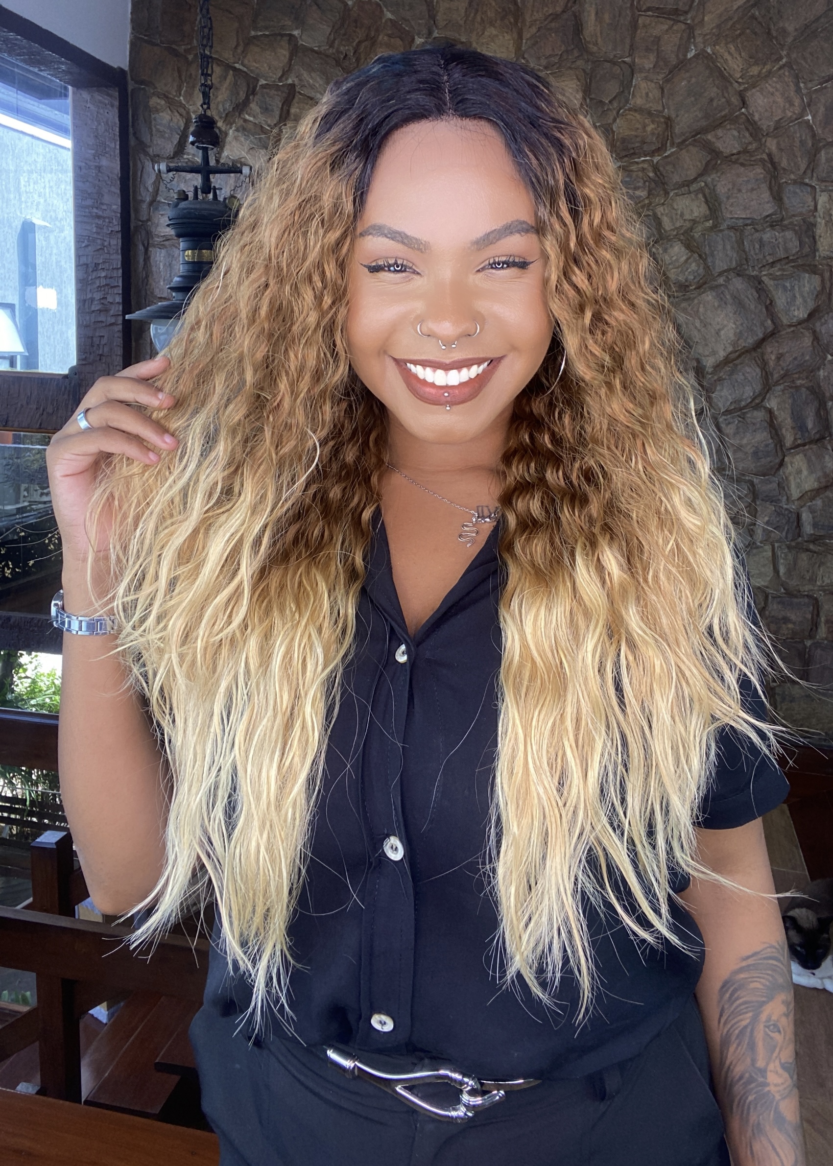 Peruca Lace Front Fibra Premium Aurora Cacheada Loiro Ombré