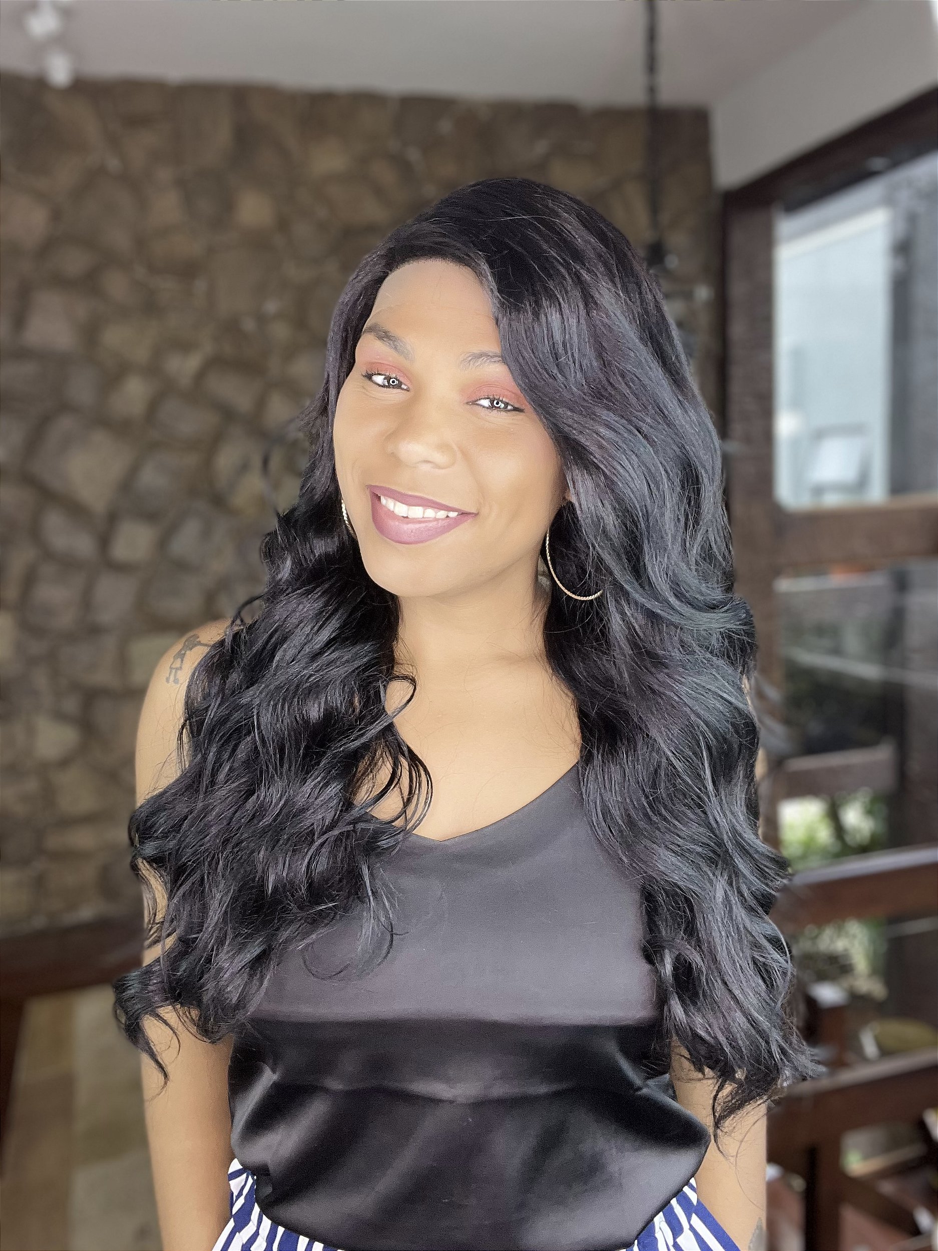Peruca lace front sintética fibra premium Rita ✅ cor preta ✅ comprimento 60 cm ✅ ondulada ✅ possui elástico de ajuste ✅ possui grampos de ajuste ✅ lace de orelha a orelha ✅ repartição lateral deep part ✅ Suporta secador até 180 graus c ✅Suporta chapinha até 180 graus c